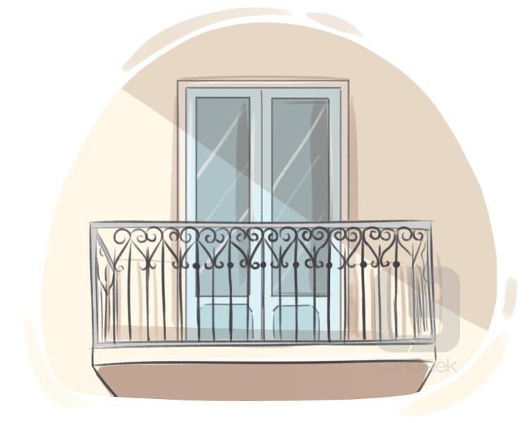a platform above the ground level and on the outside wall of a building that we can get into from the upper floor