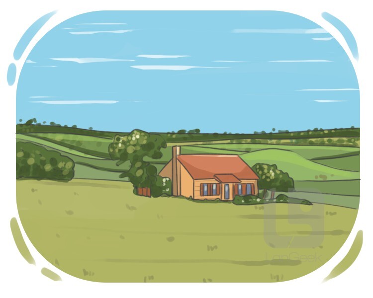an area with farms, fields, and trees, outside cities and towns