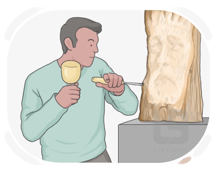 to carve or shape a material, typically wood or stone, by using a sharp-edged tool with a flat metal blade