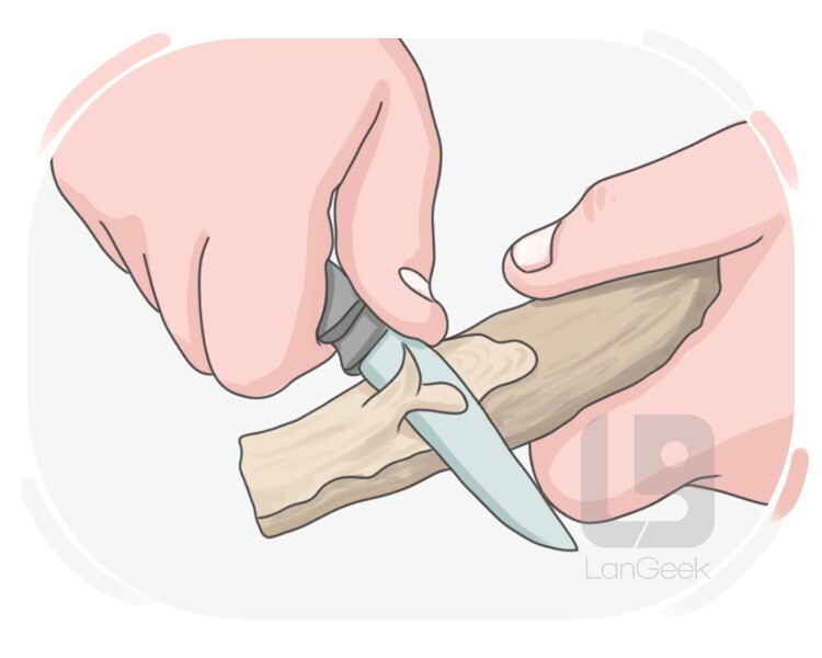 to carve or shape small pieces from a material, usually wood, using a knife or similar tool