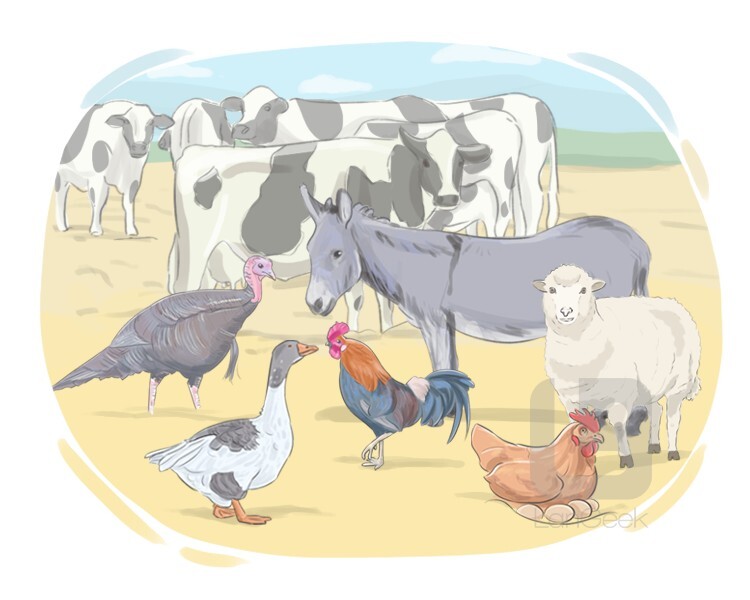 animals that are kept on a farm, such as cows, pigs, or sheep