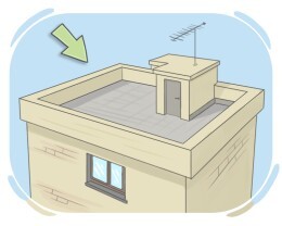Vysoká budova vyniká mezi ostatními stavbami ve městě.