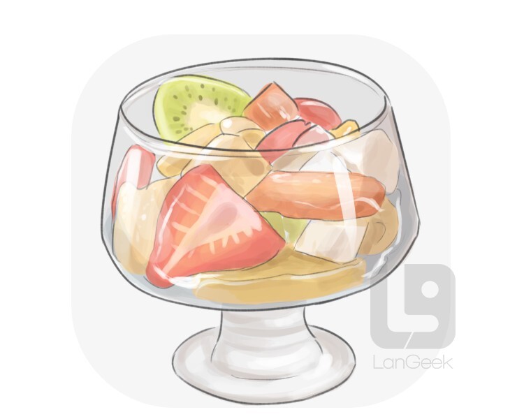 a dish typically made with a mixture of various fresh fruits, such as melons, strawberries, grapes, and pineapple, that are cut into small pieces and served in a cup or bowl, often with a sweet syrup or whipped cream