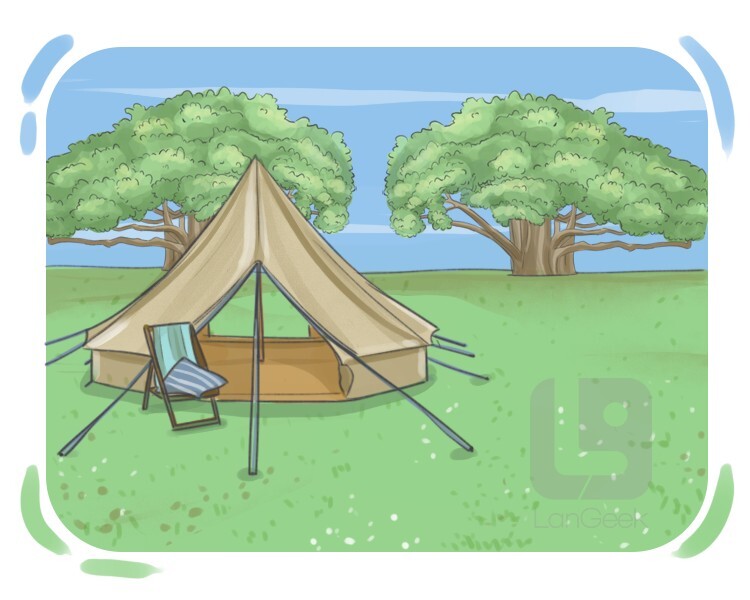 a shelter that usually consists of a long sheet of cloth, nylon, etc. supported by poles and ropes fixed to the ground, that we especially use for camping