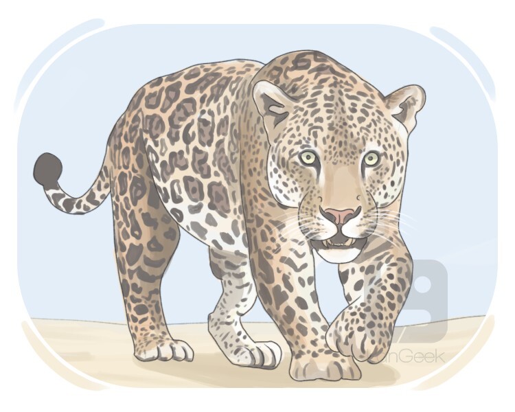 a large wild animal belonging to the cat family with a yellow fur covered with black spots, native to Central and South America