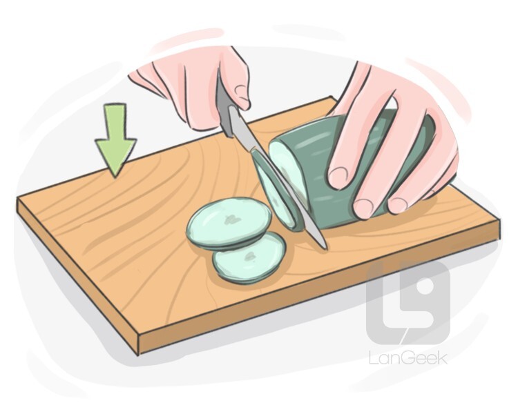 a flat board used in the kitchen for cutting vegetables, fruits, meat, and other food items