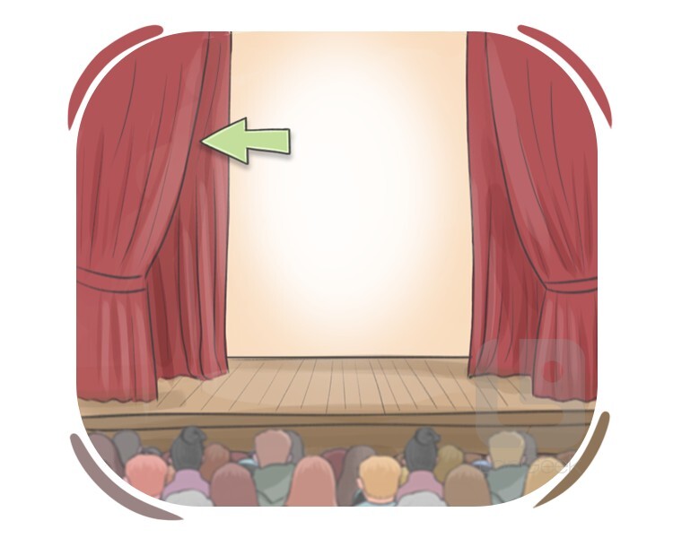a thick heavy piece of cloth that is hung in front of a stage in a theater and is raised or pulled aside when a performance begins