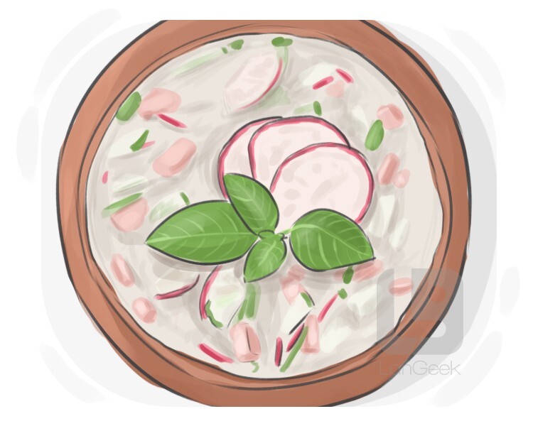 a cold Russian soup typically made with kvass or kefir, boiled potatoes, and chopped vegetables and often served with boiled eggs and sour cream