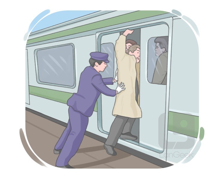 (of a lot of people or animals) to attempt to fit into a densely packed environment or a limited space