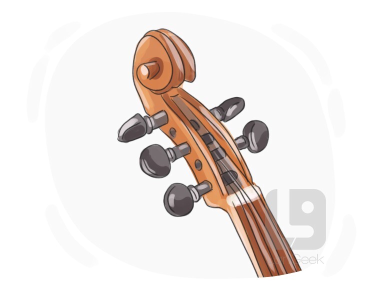 the decorative, often curved, end of the peg box on certain string instruments, such as violins and cellos