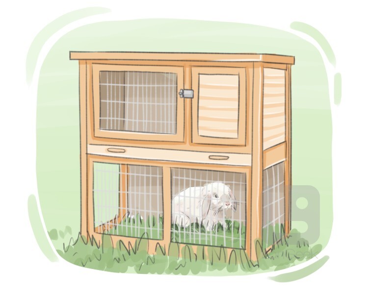 a wooden box with a wired front used for keeping small domesticated animals, such as rabbits, ferrets, etc.