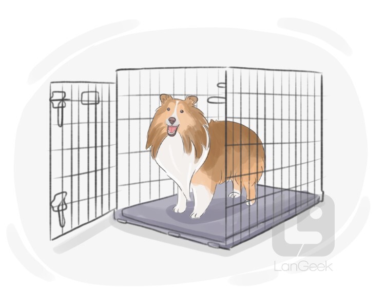 a type of cage or enclosure designed to safely contain a dog for short periods of time, usually for transportation, training, or as a secure resting place