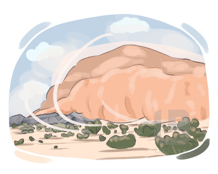 a strong wind, mostly in a desert, that lifts particles of sand and blows them around
