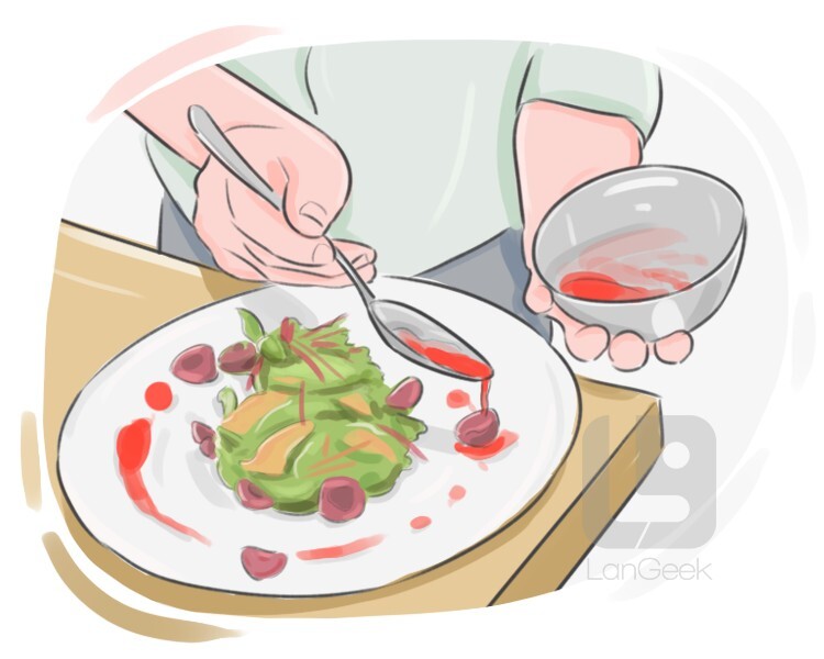 to pour a thin, fine stream of liquid, such as sauce, oil, or syrup, over food