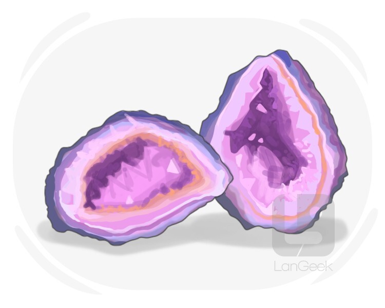 a hollow rock with a cavity inside, lined with crystals or mineral material, formed through natural processes and often valued for its aesthetic qualities
