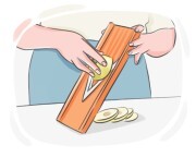 A zöldségszeletelőt használta, hogy gyorsan egyenletes szeletekre vágja az uborkákat.