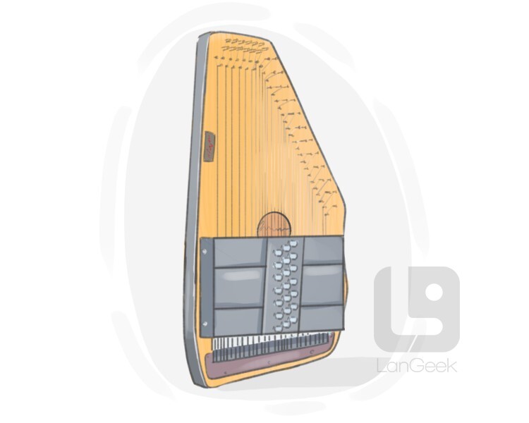 a musical instrument resembling a small harp that employs a button-controlled mechanism for selecting chords