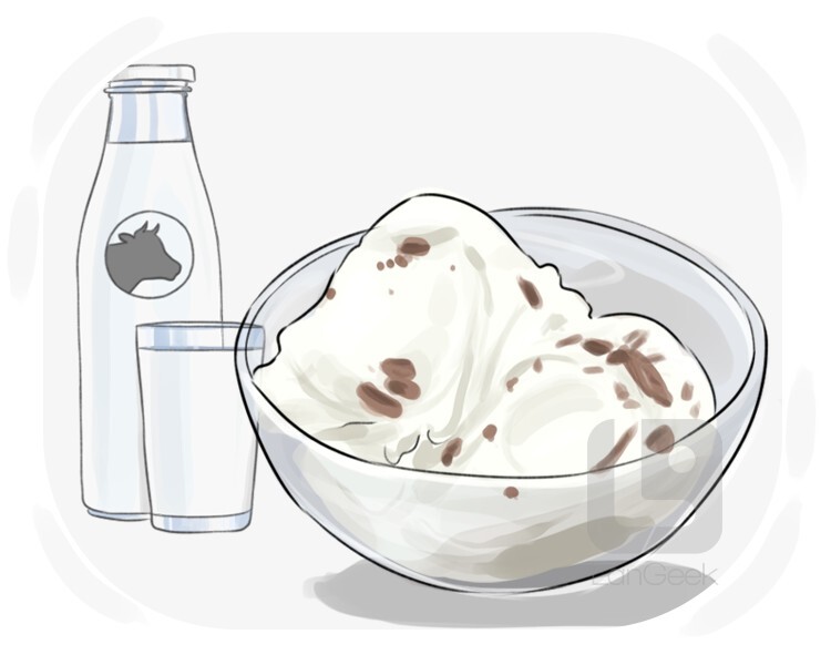 a sweet and cold dessert that is made from a mixture of milk, cream, sugar, and various flavorings