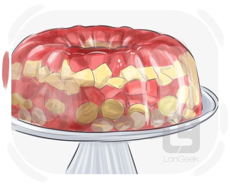 a dessert salad made with gelatin (such as Jell-O), mixed with fruits, vegetables, whipped cream, cottage cheese, or other ingredients, often served at potlucks, holidays, or family gathering