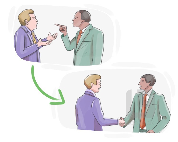 (of two or more parties) to agree with each other's terms or opinions in order to reach an agreement