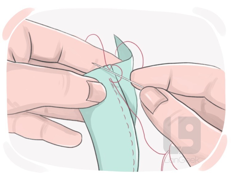 to join two or more pieces of fabric or other materials together, often by using a needle and thread