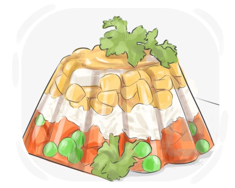 a savory jelly made from meat or fish stock used to set ingredients in a solidified form
