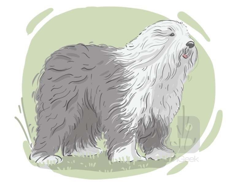 a very large and shaggy English dog with a white and grayish coat that is used in herding