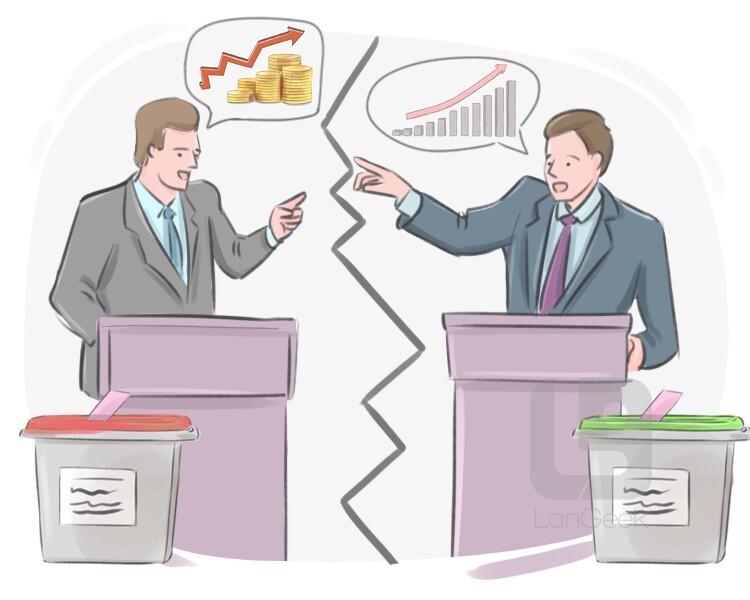 a discussion, typically a serious one, between two or more people with different views