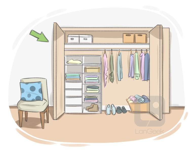 a piece of furniture with shelves and doors, usually built into a wall, designed for storing things like foods, dishes, etc.