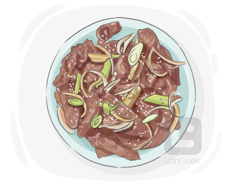 a Korean dish made with thinly sliced marinated beef that is grilled or pan-fried