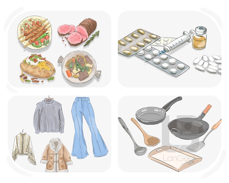 (plural) necessary things, such as food, medicines, clothes, etc. for a group of people