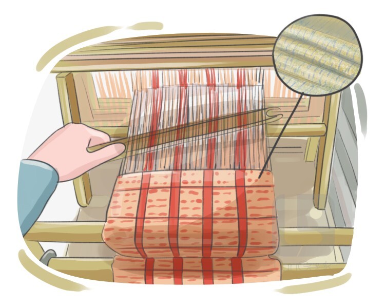 a weaving tool that is used to carry the weft thread through the warp threads of a loom, consisting of a pointed or flattened wooden or plastic stick with a bobbin or spool of thread or yarn attached to one end