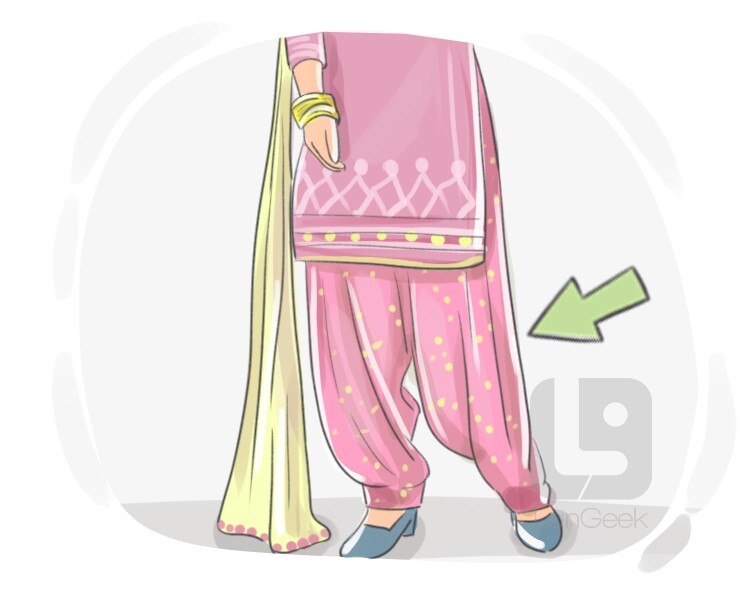 a pair of loose-fitting pajama-like pants, typically worn by women in South and Central Asia, which tapers to a narrow fit around the ankles