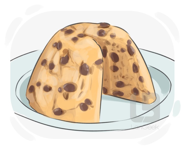 an English molded pudding containing raisins or other dried fruits that is steamed and cooked