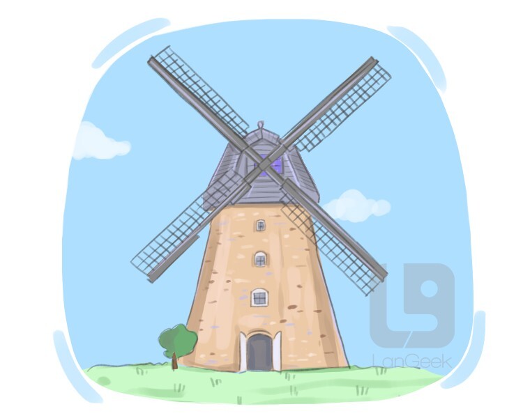 a large, tall building with long blades, called sails, that uses wind power to make flour out of grain or pump water