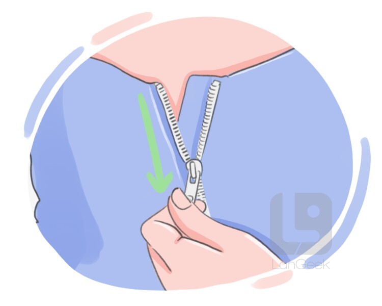 to separate the two sides of a zipper on a piece of clothing or other item by pulling the slider or tab down