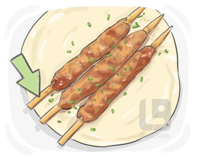 a long wooden or metal stick that is inserted into pieces of food, especially meat, to hold them together while being cooked