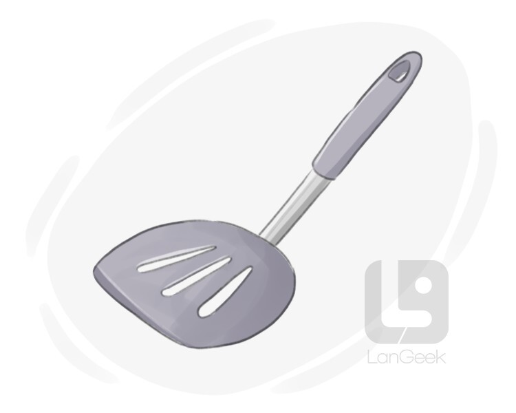 a kitchen tool used to flip or turn pancakes, eggs, burgers, and other foods while cooking on a griddle or frying pan