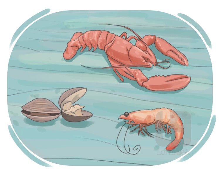 a type of sea creature with a shell, such as clams, oysters, mussels, shrimp, lobster, etc.
