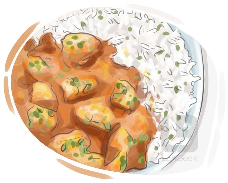 a variety of dishes originating from South Asia, typically made with meat, vegetables, etc., cooked in a hot sauce and then served with rice