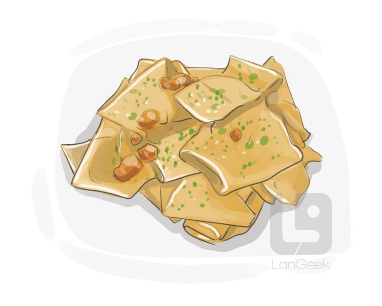 small square-shaped pasta stuffed with cheese, ground meat, fish, etc. and usually served with a sauce, originated in Italy