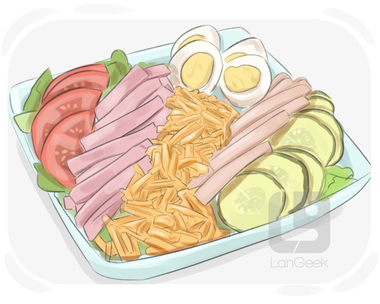 a salad that consists of hard-boiled eggs, tomatoes, lettuce, and strips of cheese and meat