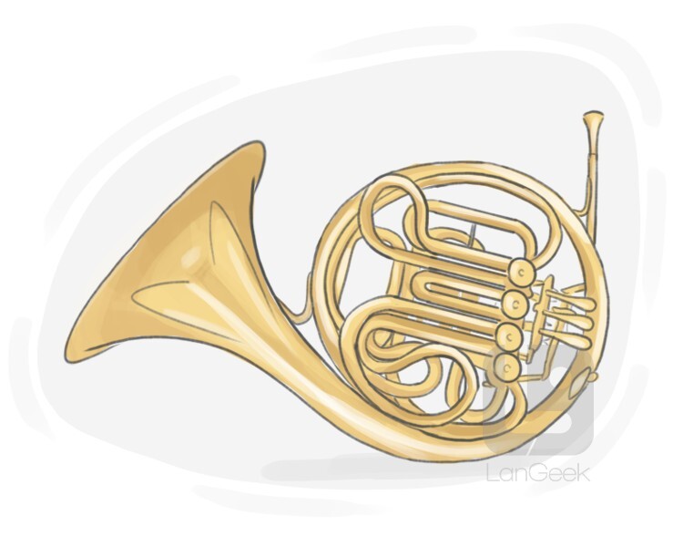 a brass instrument with a coiled tube and flared bell, played by buzzing the lips and adjusting valves and hand placement for different pitches