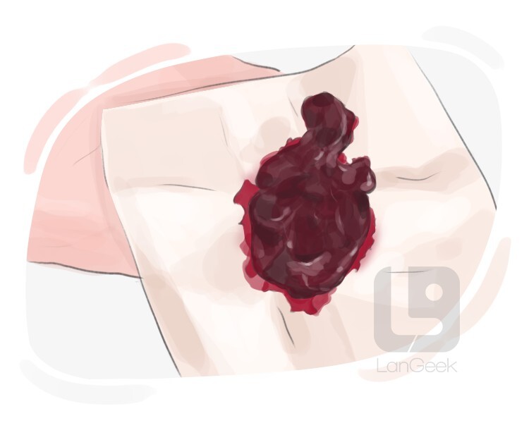 a thickened or dried mass of blood that if formed in a blood vessel may impede blood circulation