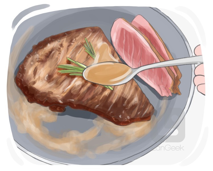 to pour fat, juices, or other liquid over the surface of food, such as meat or vegetables, while it is cooking