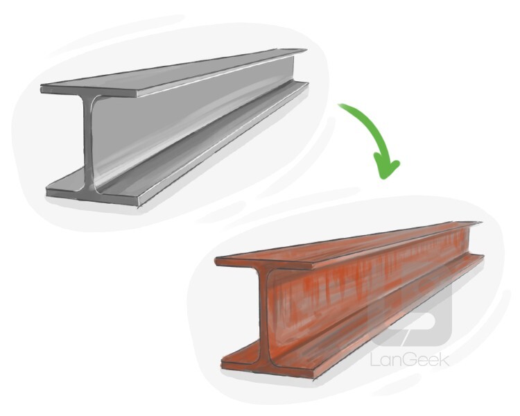 to develop a reddish-brown coating, usually on metal, due to exposure to air and water over time