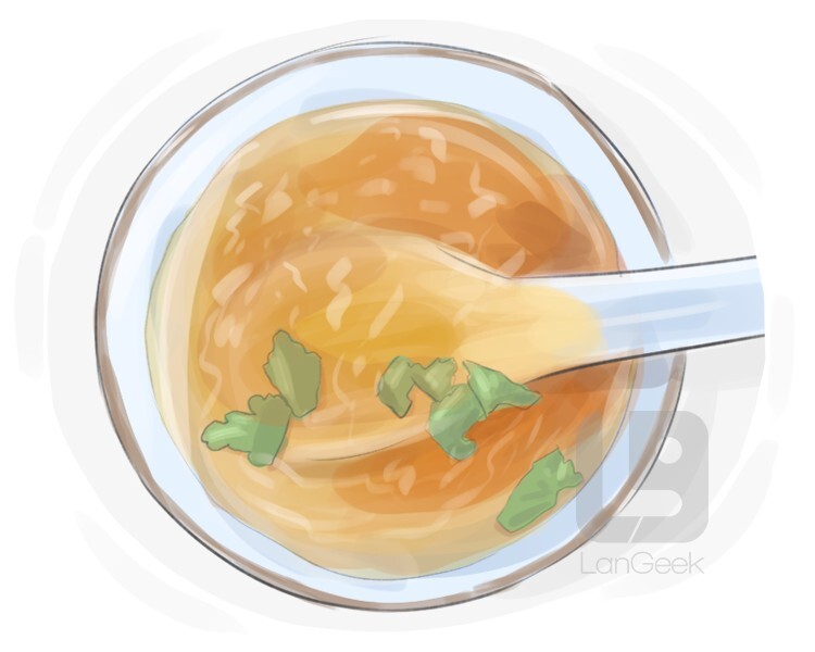 a broth made by simmering meat, fish, or vegetables with seasonings to yield a translucent liquid