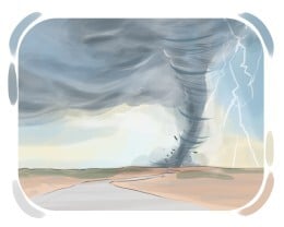 a strong and dangerous type of wind, which is formed like a turning cone, usually causing damage