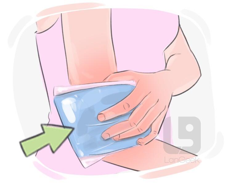 a waterproof bag filled with frozen material, such as crushed ice, used to cool parts of the body to reduce swelling, relieve pain, etc.