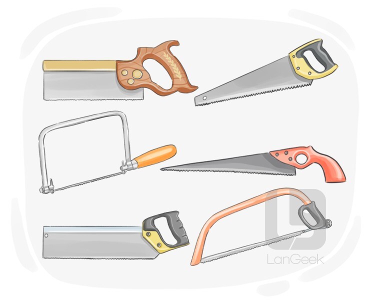 a metal tool with a toothed blade that is used for cutting wood, metal, etc. by moving back and forth
